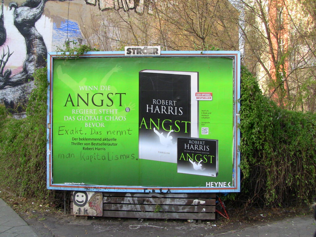 In Berlin Kreuzberg sind Passant_innen dank einer Adbuster_in kostenlos in den Genuss einer zweiten Bedeutungsebene gekommen. Was, wenn die Werbezeile „Wenn die Angst regiert, steht das globale Chaos bevor“ gar nicht die nahe Zukunft beschreibt, sondern die Gegenwart? Herrscht im Kapitalismus die Angst? Und haben wir vielleicht sogar schon das globale Chaos?